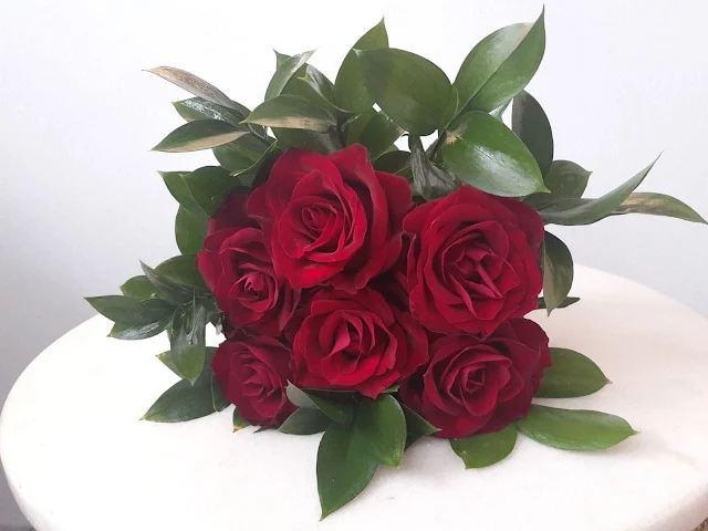 Com 12 rosas importadas, 9 ruscus e laço de Ráfia = 220,00R$